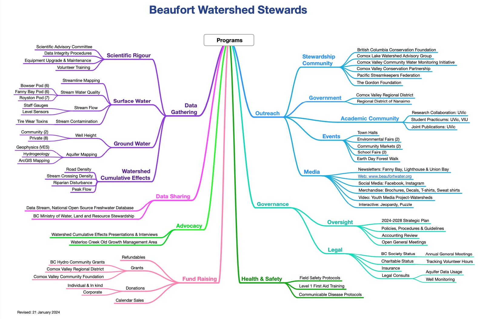 For those of us who have been with Beaufort Watershed Stewards for a while, we often have the sense that we have a lot of things on the go. Then comes time for the annual update to our BWS Program Map. Then we are generally astounded by how much we have grown, and the magnitude of the programs on the go. This map gives the overview. If you are new to BWS, we are happy to provide a personal tour of the information. That is how new members seem to find their niche in the organization.